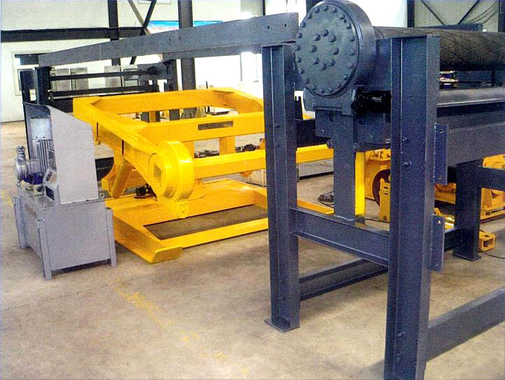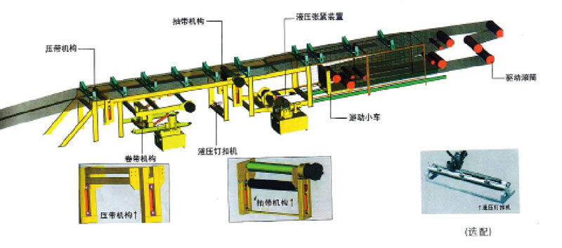 4、松開(kāi)壓帶機(jī)構(gòu)及抽帶機(jī)構(gòu)。 操作卷帶機(jī)構(gòu)帶動(dòng)支架旋轉(zhuǎn)與輸送機(jī)成垂直位置,將卷好的皮帶放上運(yùn)輸車。